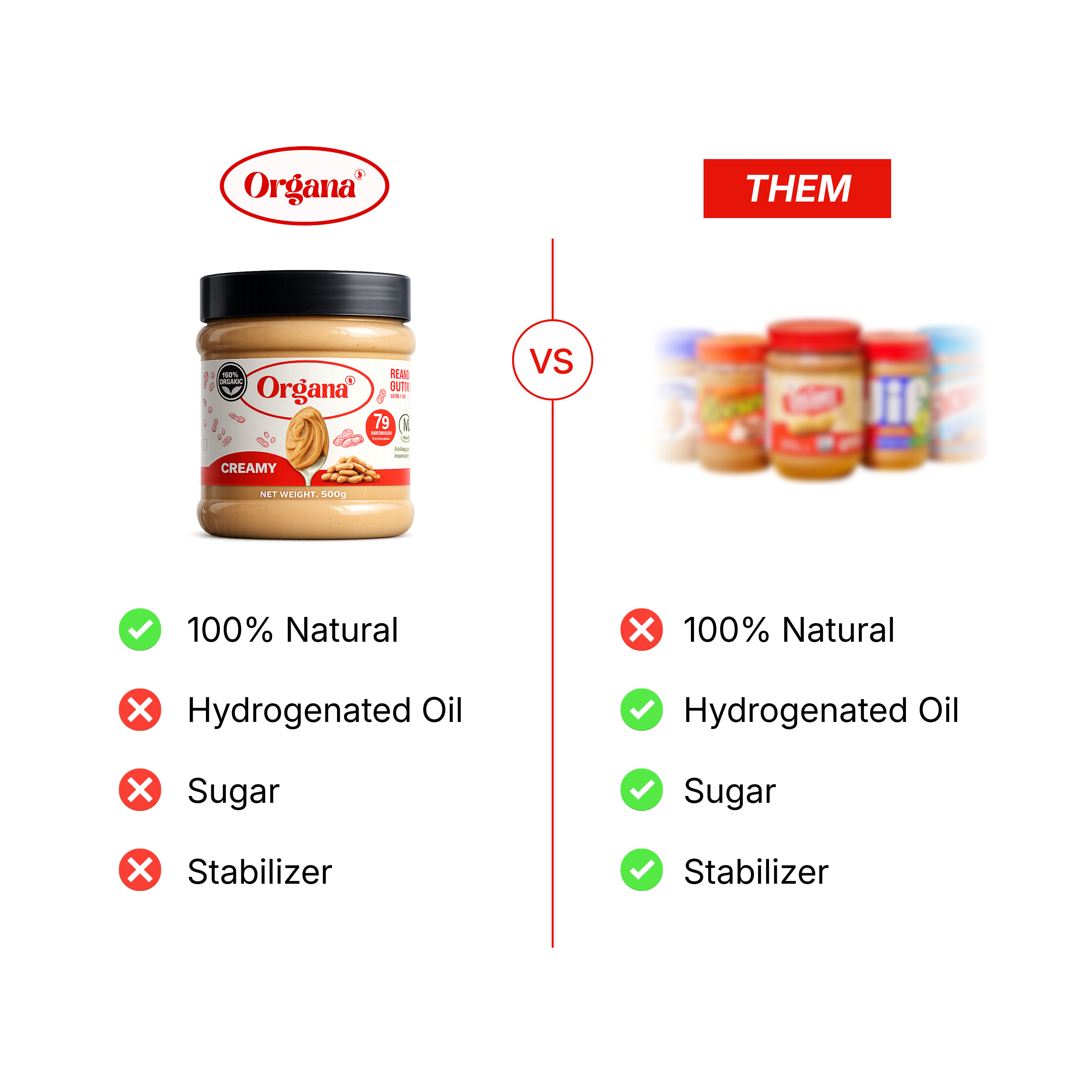 Organa is made with 100% pure peanuts, homemade in small batches, with no sugar, no preservatives, and no added palm or hydrogenated oils. Just real nutrition, nothing artificial.
